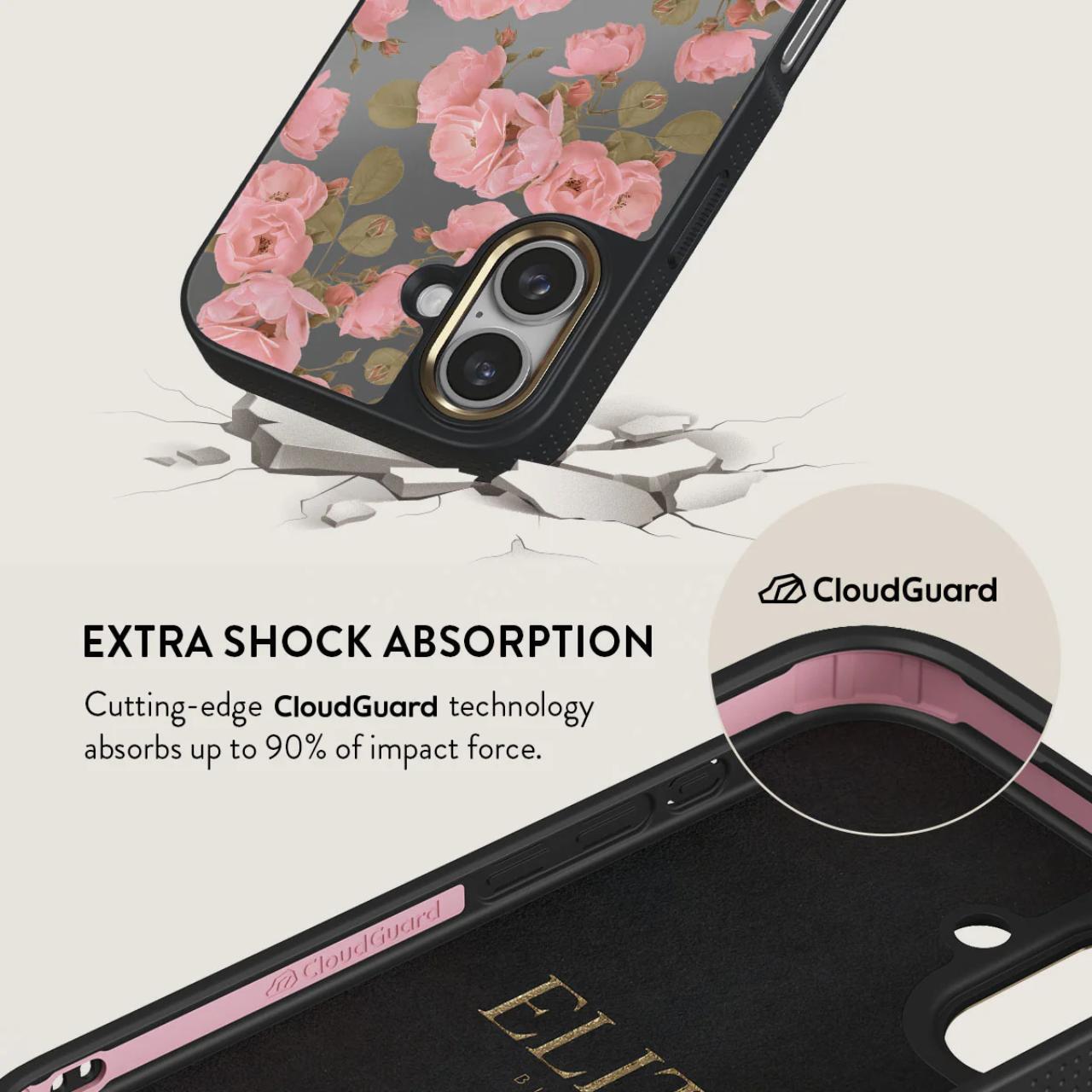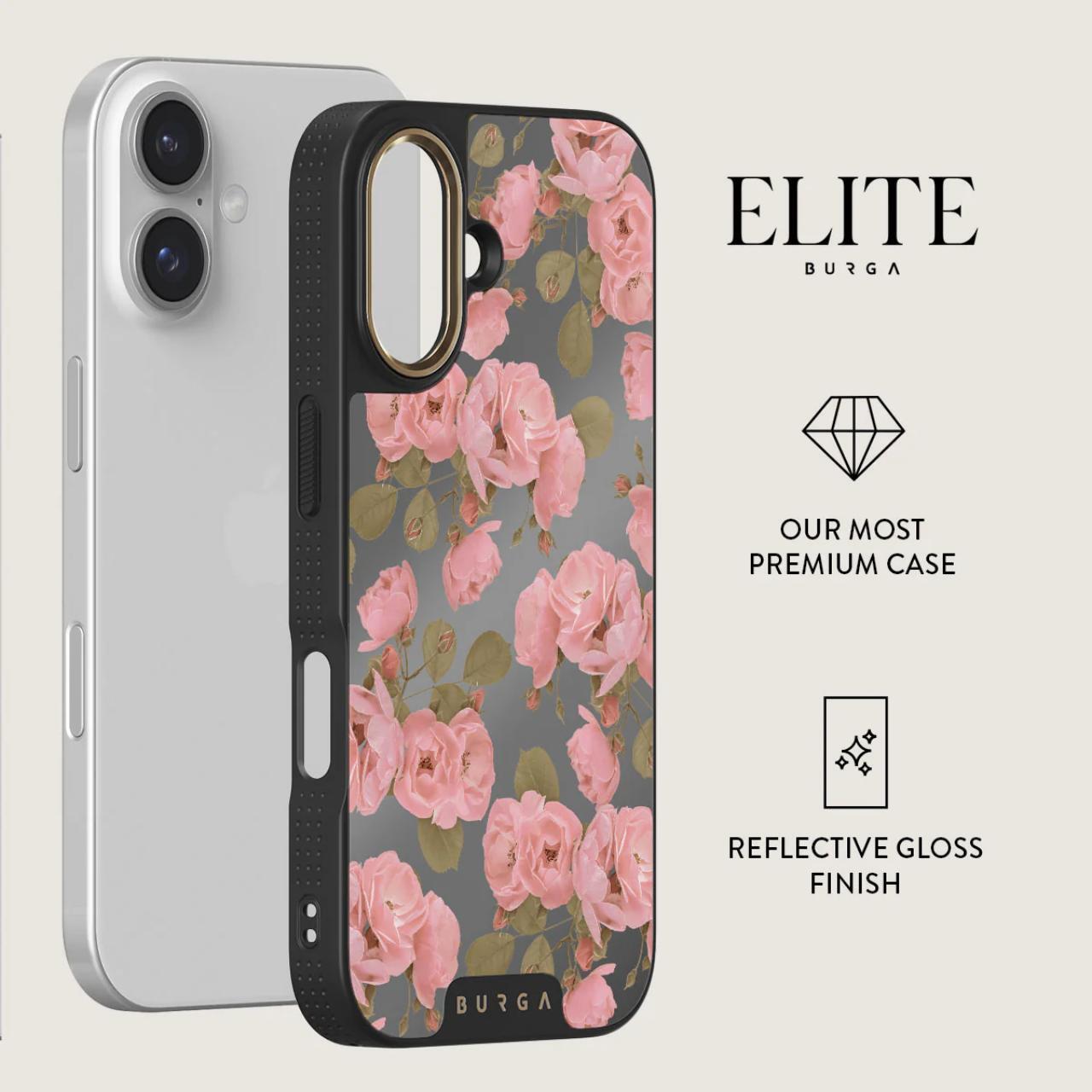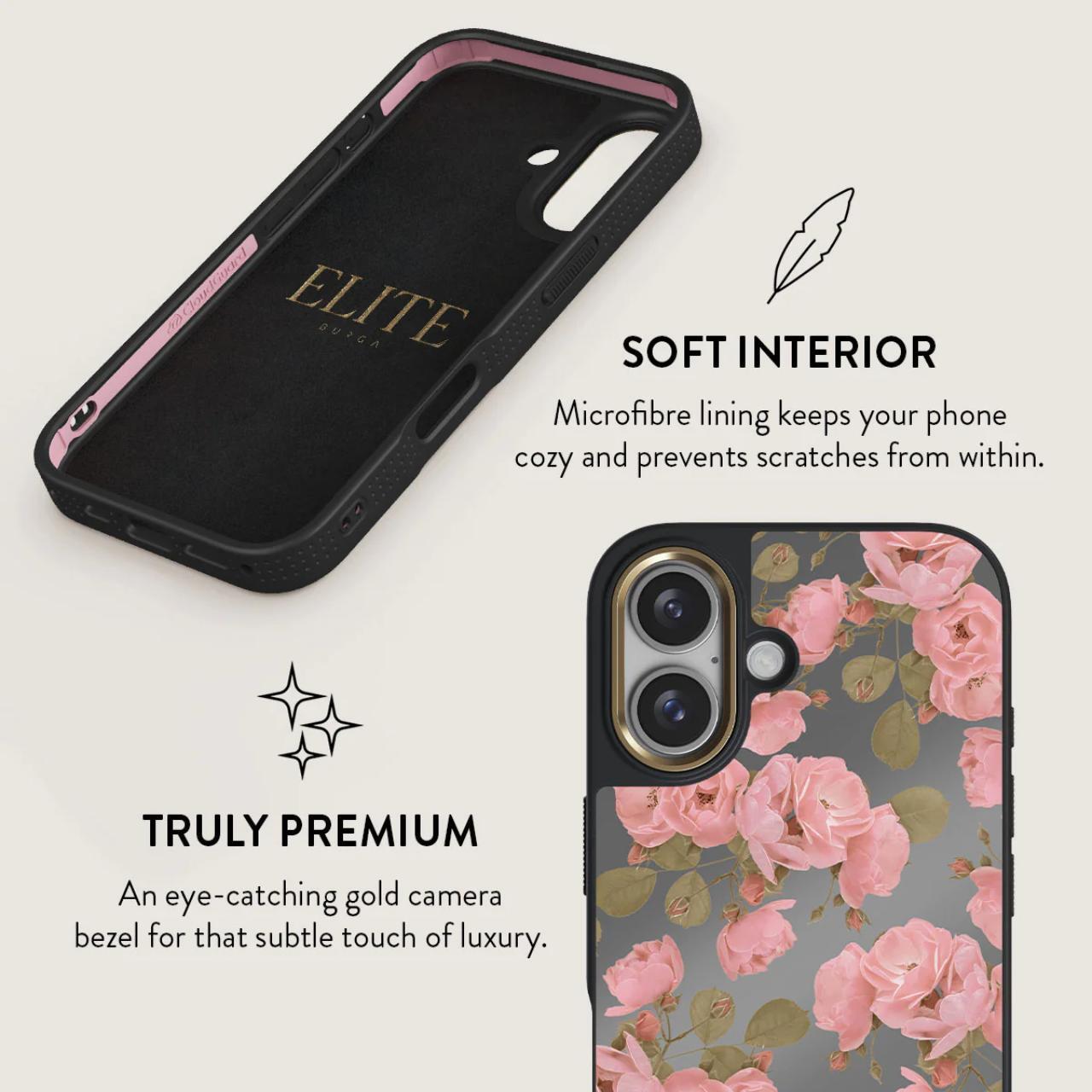 Funda Elite Mirror Magsafe Gold Desert Rose para iPhone 16 de Burga, diseñada para absorber impactos y ofrecer protección, cuenta con la última tecnología CloudGuard y un elegante acabado efecto espejo. El interior de microfibra mantiene el teléfono cómodo y previene rayones.