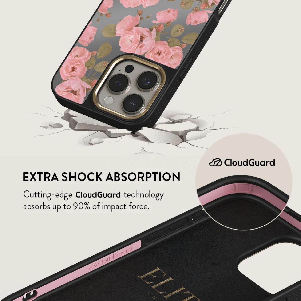 Funda Elite Mirror Magsafe Gold Desert Rose para iPhone 16 Pro de Burga, diseñada para absorber impactos y ofrecer protección, cuenta con la última tecnología CloudGuard y un elegante acabado efecto espejo. El interior de microfibra mantiene el teléfono cómodo y evita rayones.