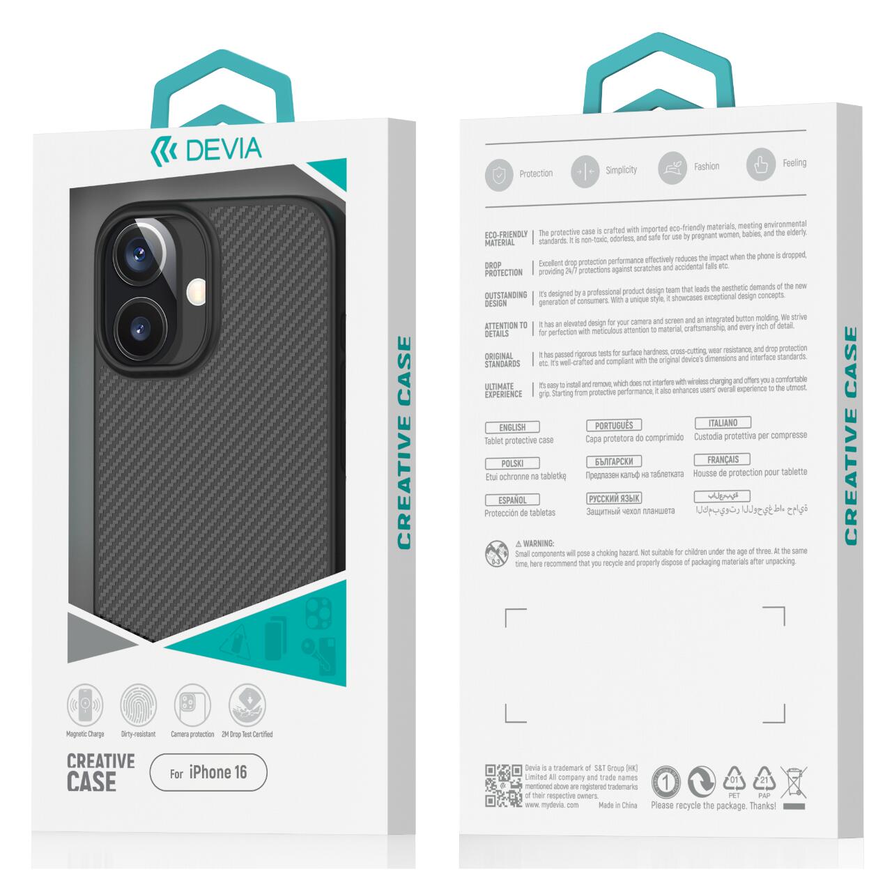 La funda Kevlar Series Ultrafina MagSafe Shockproof de Devia para iPhone 16, está fabricada con fibras de carbono en combinación con TPU que protege tu teléfono de arañazos o desgaste diario. Diseño ultrafino y ligero con imanes integrados mejorados para compatibilidad con MagSafe.