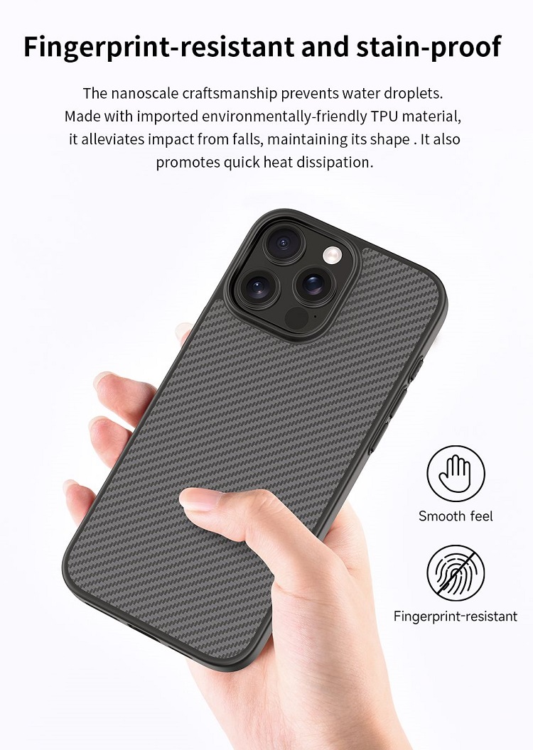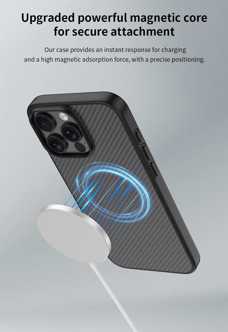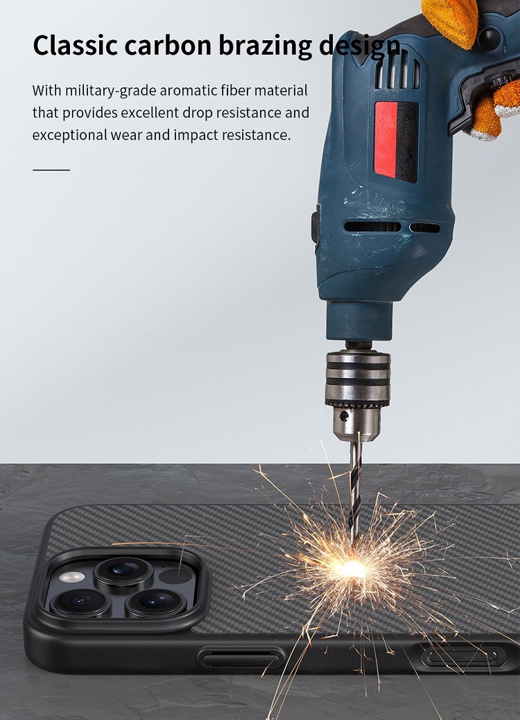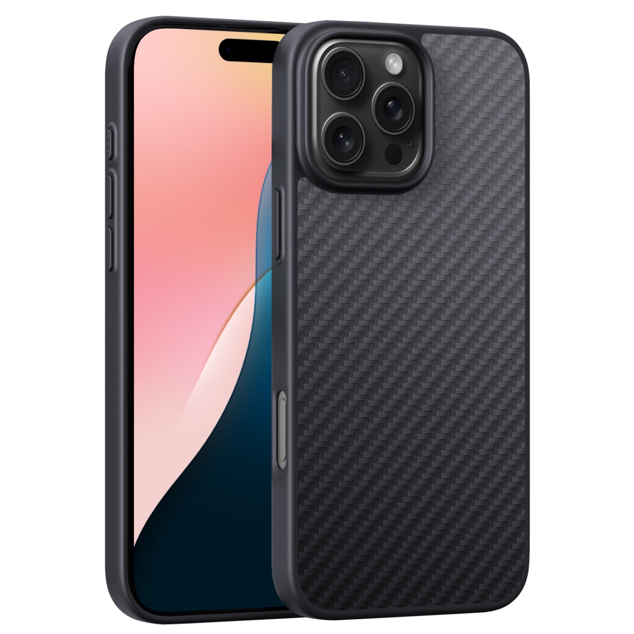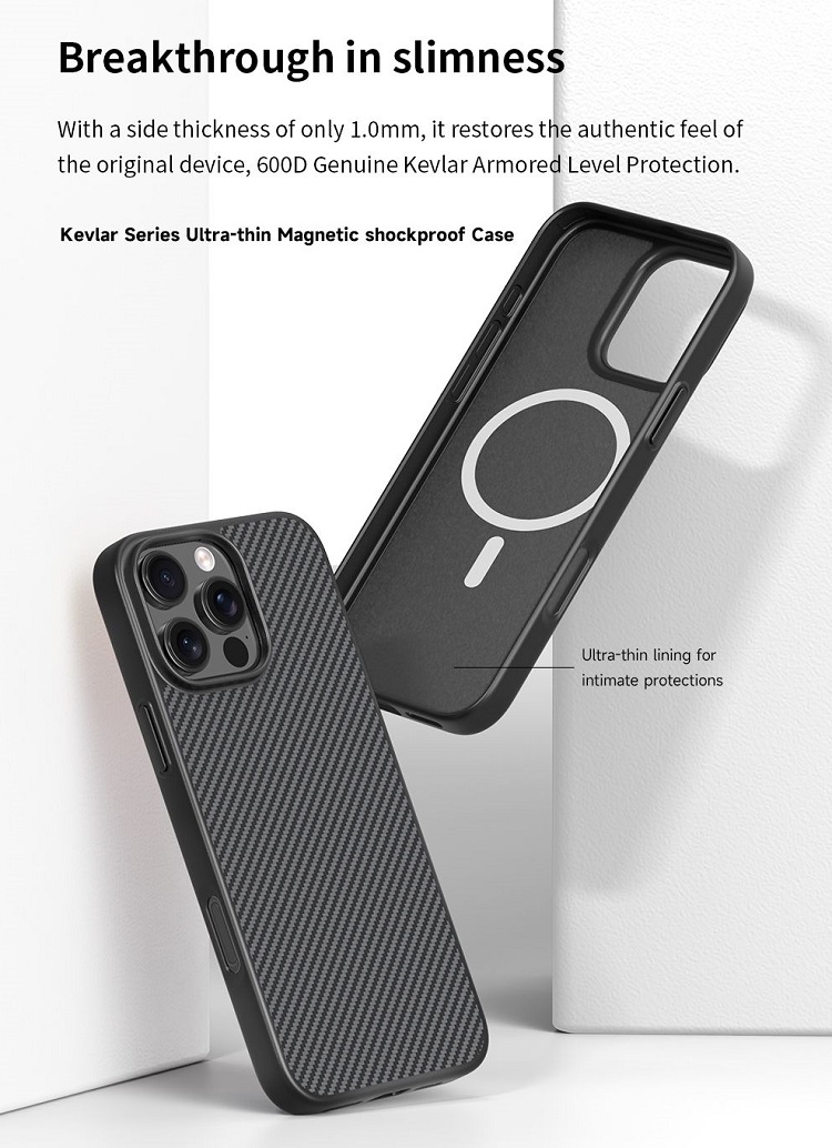 La funda Kevlar Series Ultradelgada MagSafe a Prueba de Golpes de Devia para iPhone 16 Pro, está hecha de fibras de carbono en combinación con TPU que protege tu teléfono de rayones o desgaste diario. Diseño ultrafino y ligero con imanes integrados mejorados para compatibilidad con MagSafe.