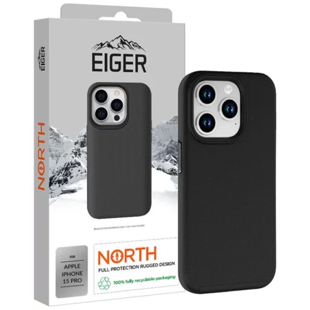 Funda Eiger North para iPhone 15 Pro, está hecha de dos capas: una uno interior fabricado en material flexible (silicona TPU) y otro exterior fabricado en material duro (Policarbonato). El material interior absorbe los golpes y el policarbonato exterior protege su teléfono contra arañazos y caídas. Está probado y diseñado para resistir caídas desde alturas de hasta 1,8 metros; los bordes ligeramente elevados del marco también protegen la pantalla.