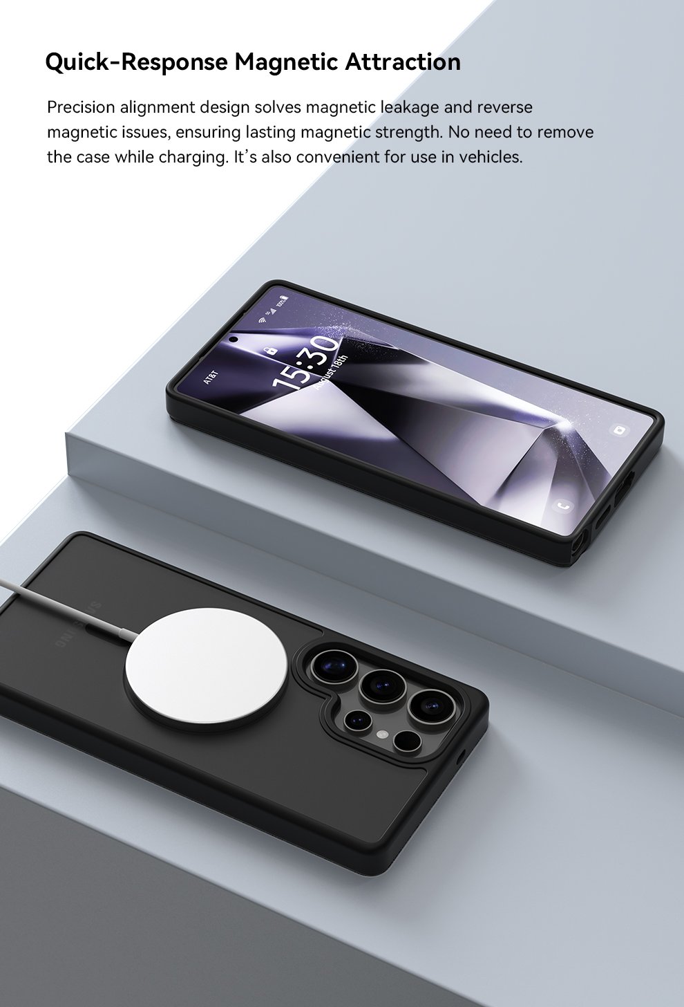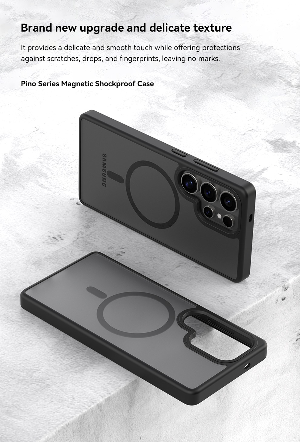 La funda de la serie Pino Magnetic Shockproof incluye bordes elevados para proteger la pantalla y la cámara, así como botones integrados para una interacción fluida con el teléfono. Con recortes precisos para puertos y altavoces, la funda es fácil de instalar y quitar, lo que garantiza un acceso completo a todos los puertos del dispositivo. Además, la funda es compatible con la carga inalámbrica, por lo que permite una carga rápida y conexiones seguras a una amplia gama de accesorios. Características: - Materiales: Policarbonato + silicona TPU - Bordes flexibles - Esquinas antigolpes - Contra arañazos, gotas de agua y huellas dactilares - Recortes precisos - Botones cubiertos - Bordes elevados alrededor de las cámaras - Semitransparente con bordes negros - Compatible con Carga inalámbrica