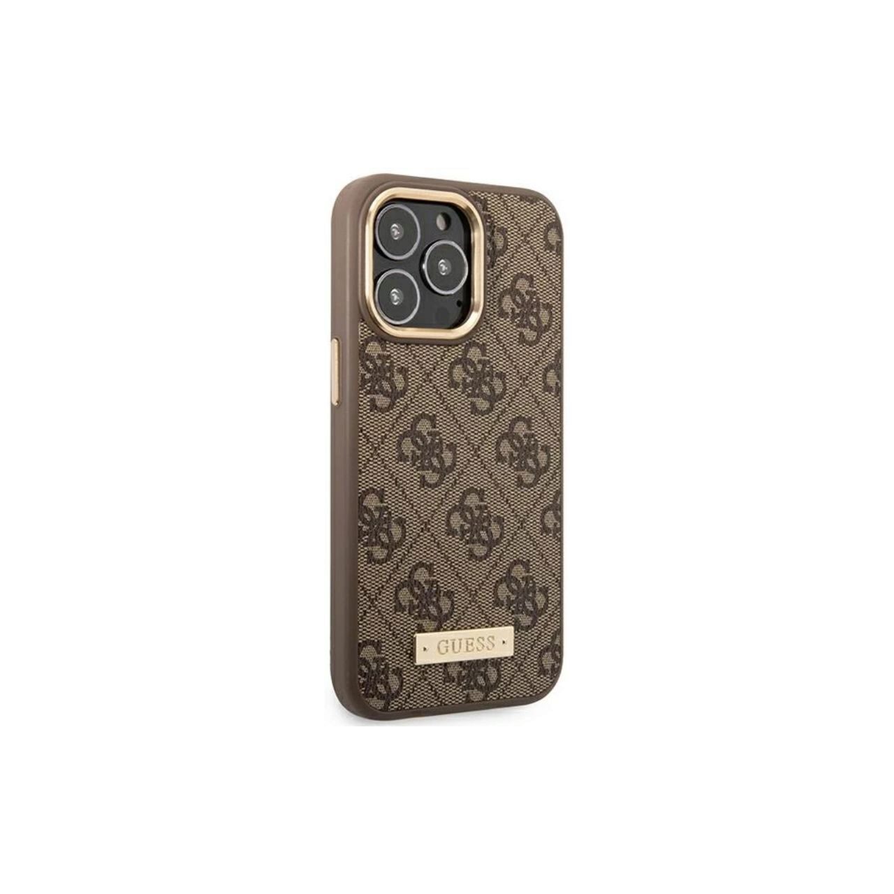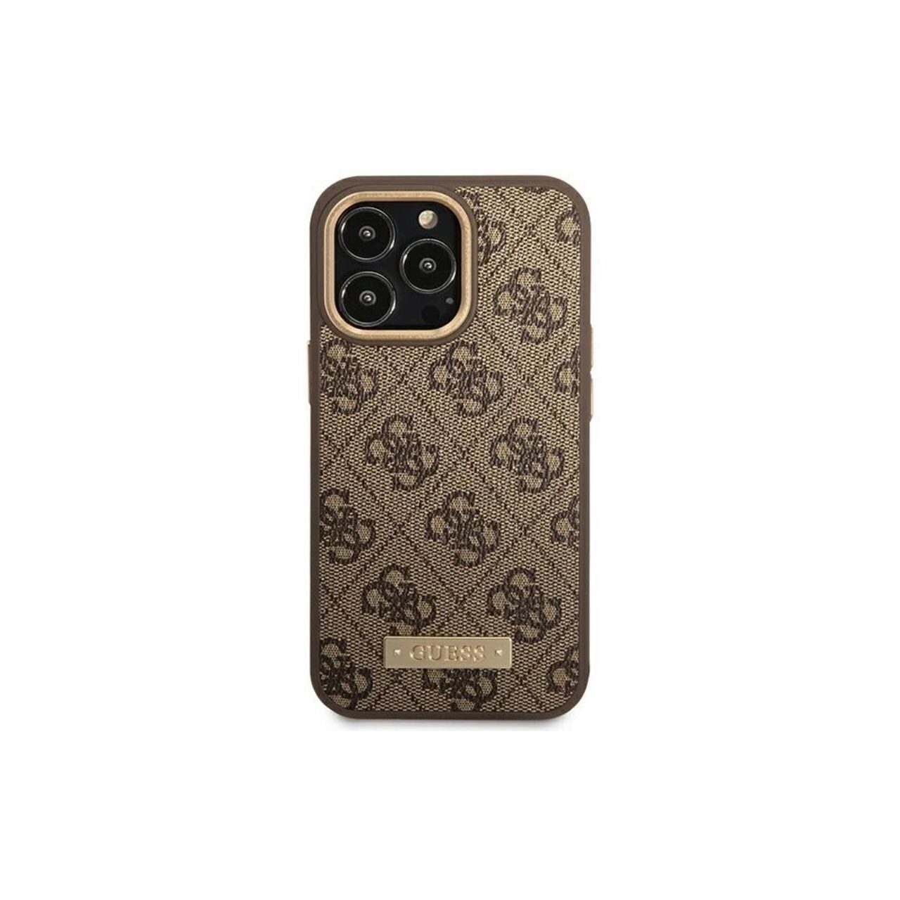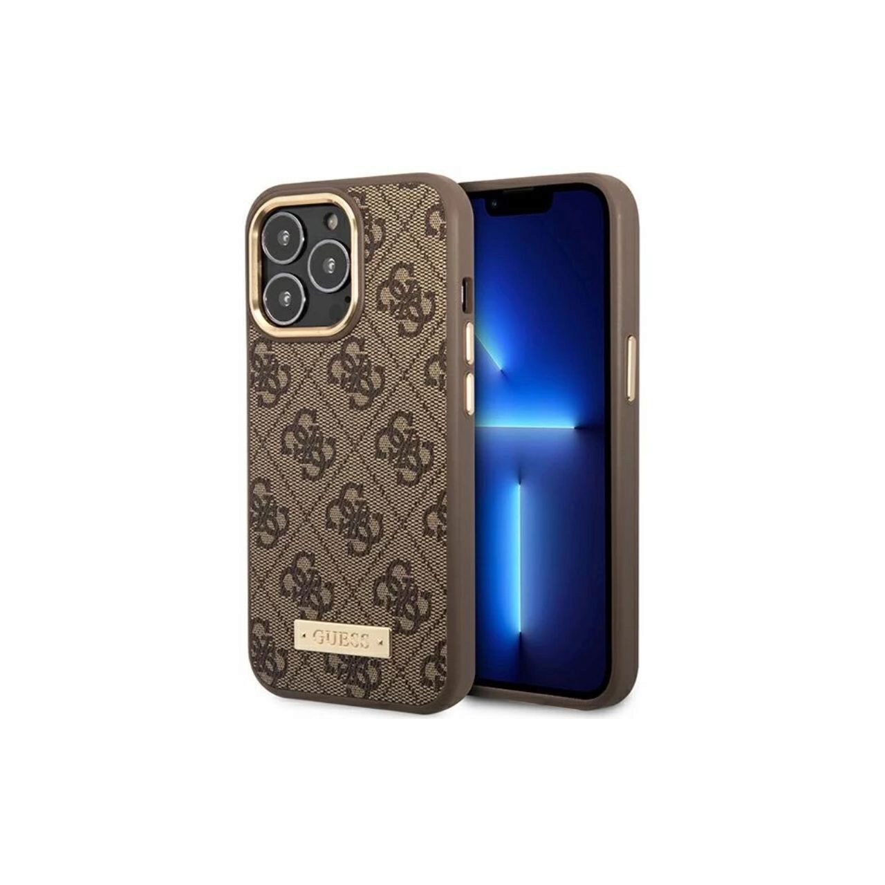 La funda con Logo Plate MagSafe para iPhone 14 Pro de Guess realza su famoso estampado atemporal, realzándolo con el logo de la marca grabado en una placa dorada.