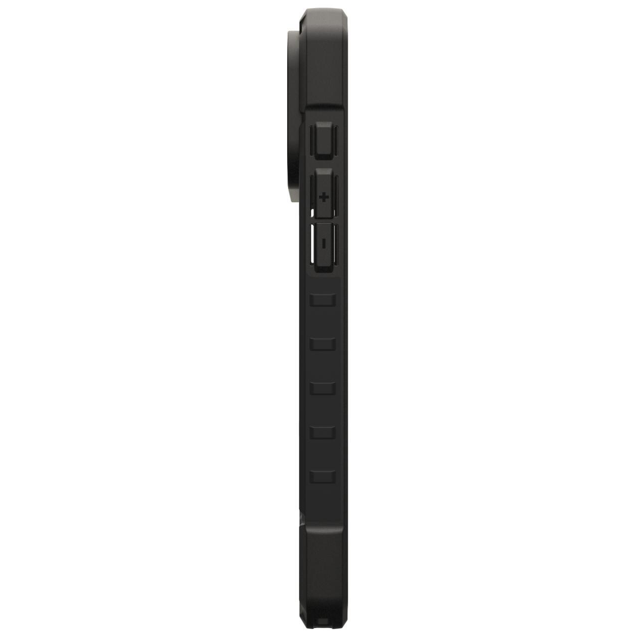 Cumple con los estándares de protección MIL STD 810G 516.6, probados militarmente contra caídas y caídas de agua. Es una protección muy ligera a pesar de su aspecto macizo, y su diseño específico de UAG es robusto, con textura en la parte trasera y los bordes que ofrece un mejor agarre. Cuenta con aberturas precisas para los puertos y las funciones del teléfono, lo que permite su uso sin necesidad de retirar la funda. Los botones están recubiertos de un material suave y con diseño en relieve para una mejor protección y uso. La funda tiene un perfil delgado y es compatible con carga inalámbrica y Apple Pay. Se monta y desmonta fácilmente del teléfono.