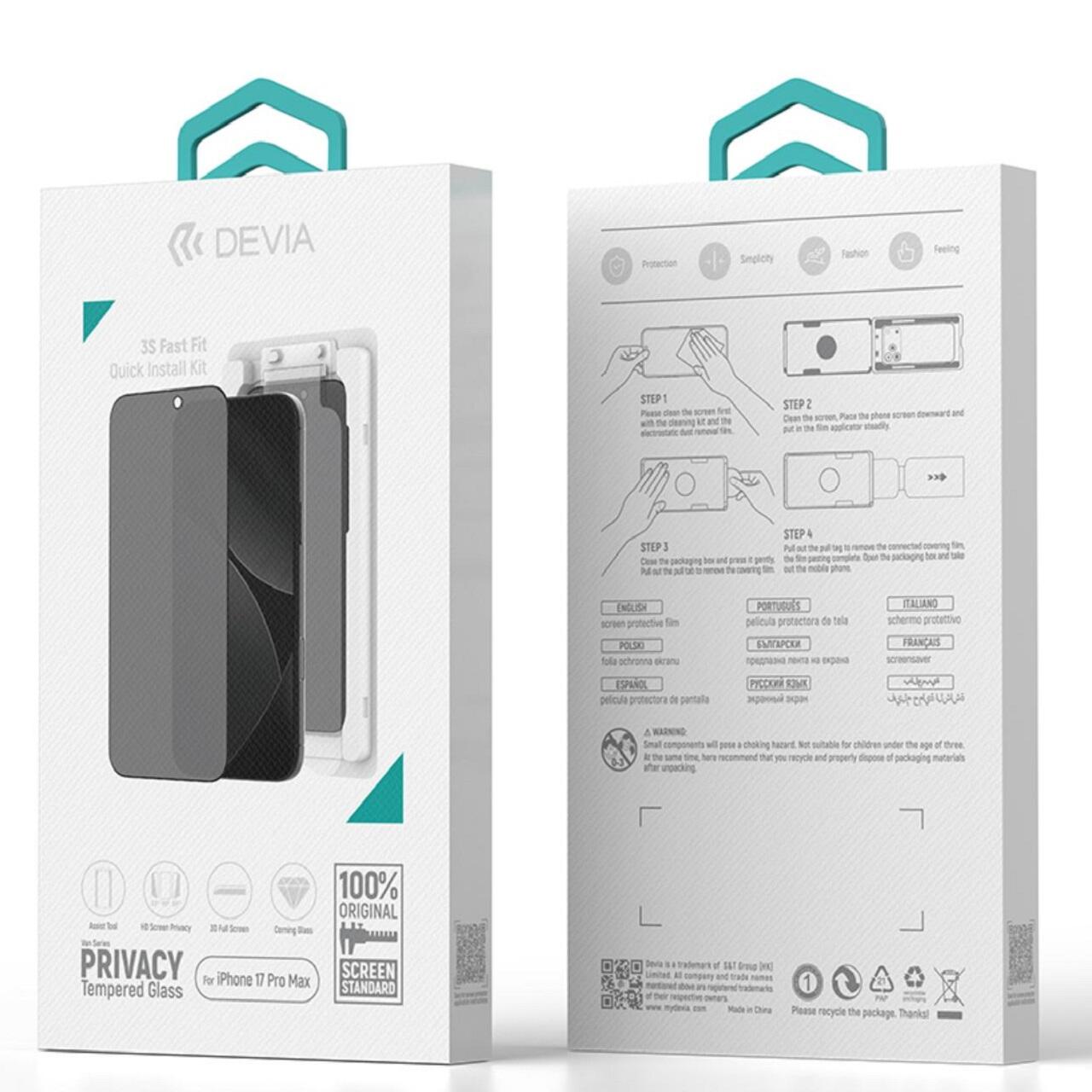 Película de vidrio de privacidad premium Devia con aplicador incluido Van Series, pantalla completa, iPhone 17 Pro Max