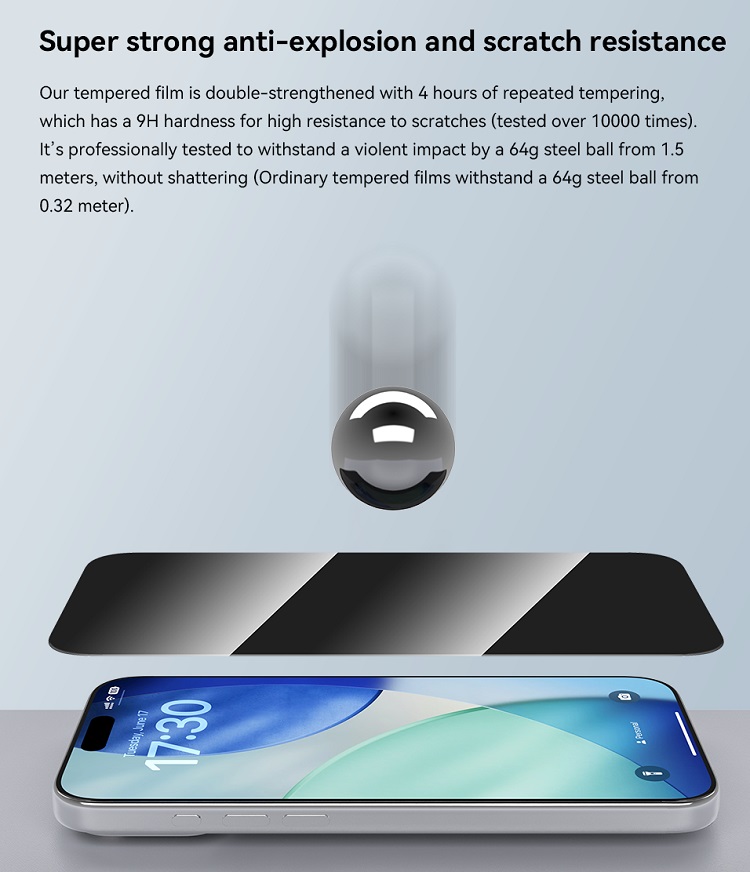 La película de vidrio de privacidad de pantalla completa Van Series, con kit de montaje especial de Devia para iPhone 17 Pro Max es una película premium hecha de vidrio templado (seguro), muy resistente a arañazos y golpes y resistente a altas temperaturas y tiene una capa protectora oleofóbica que protege contra las manchas.