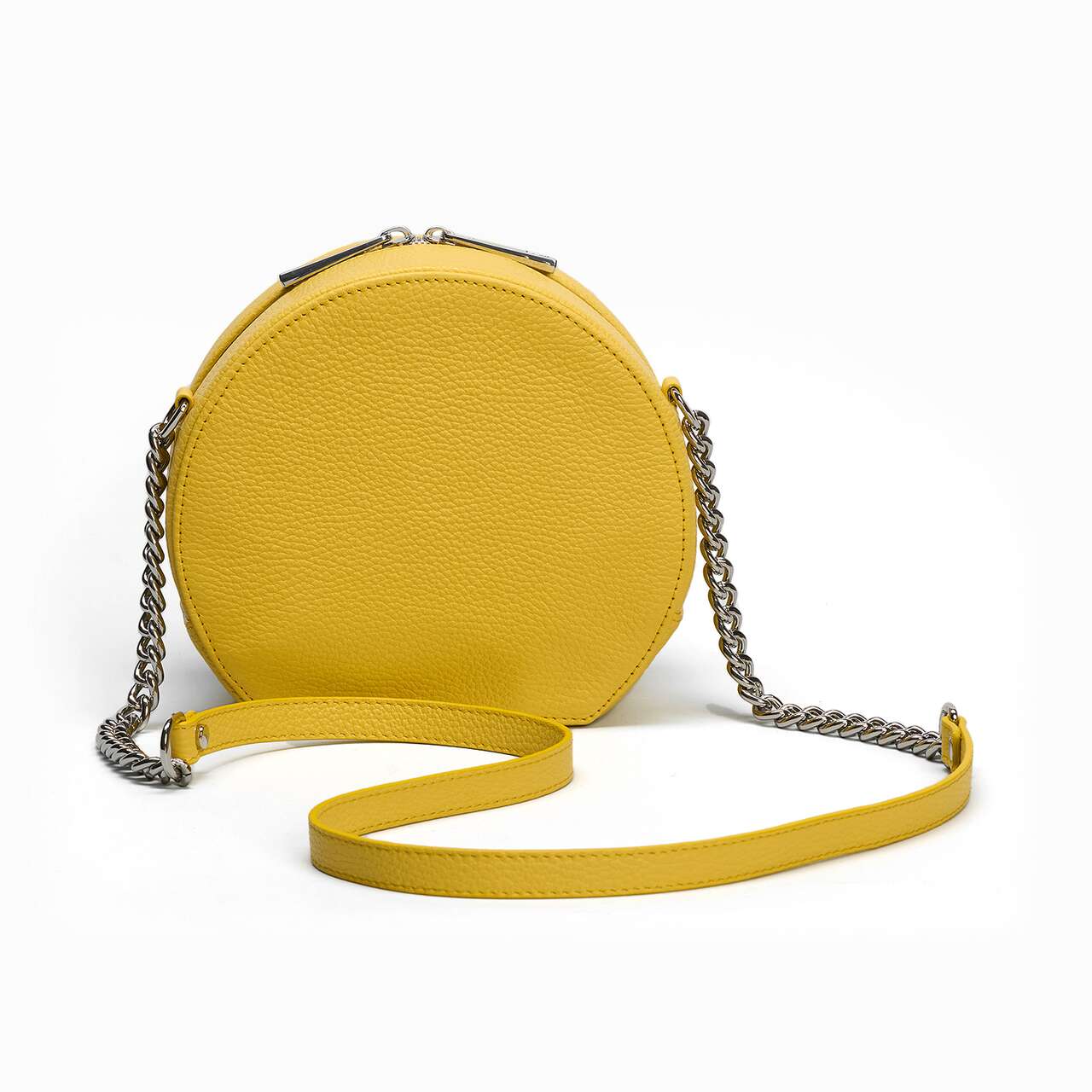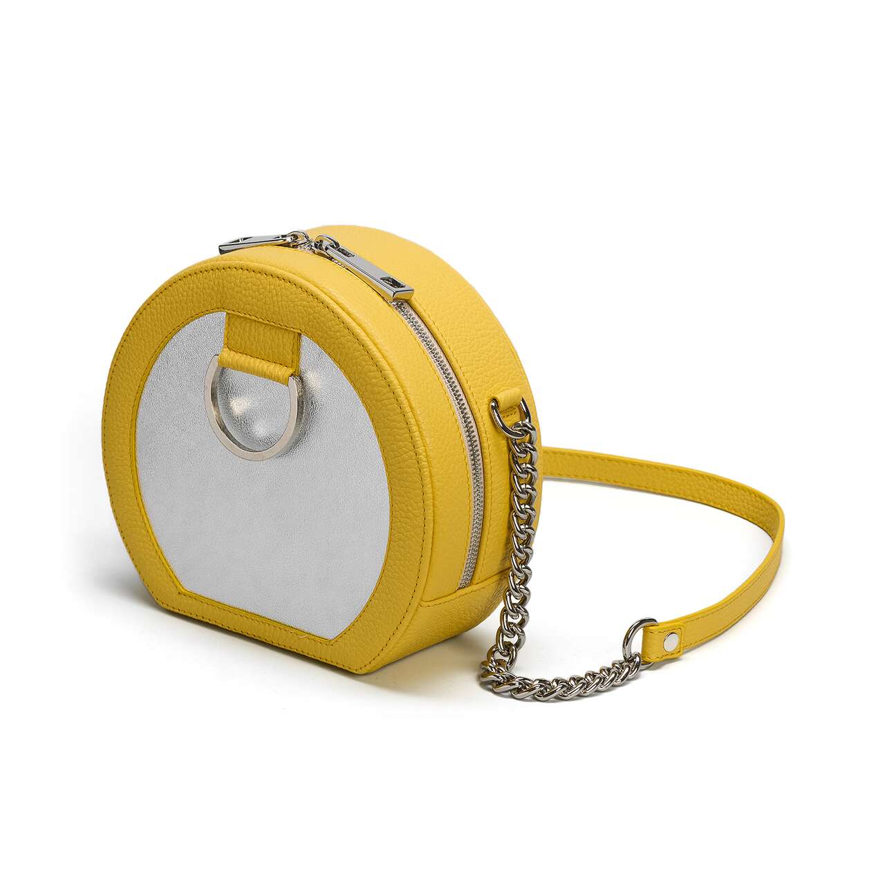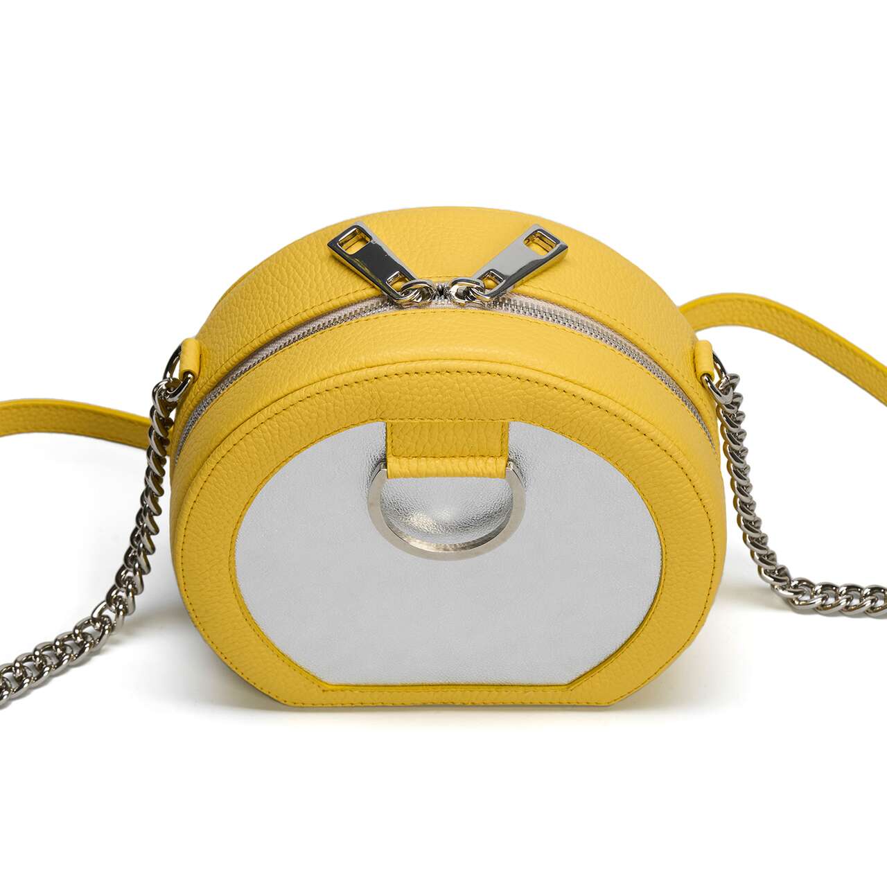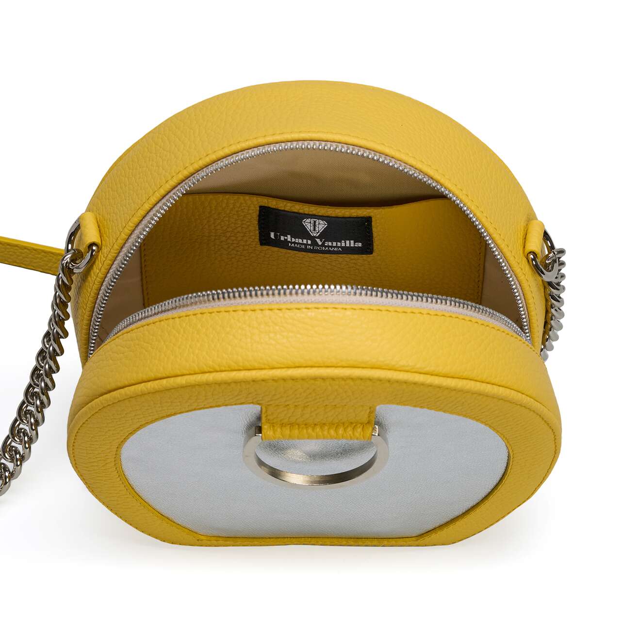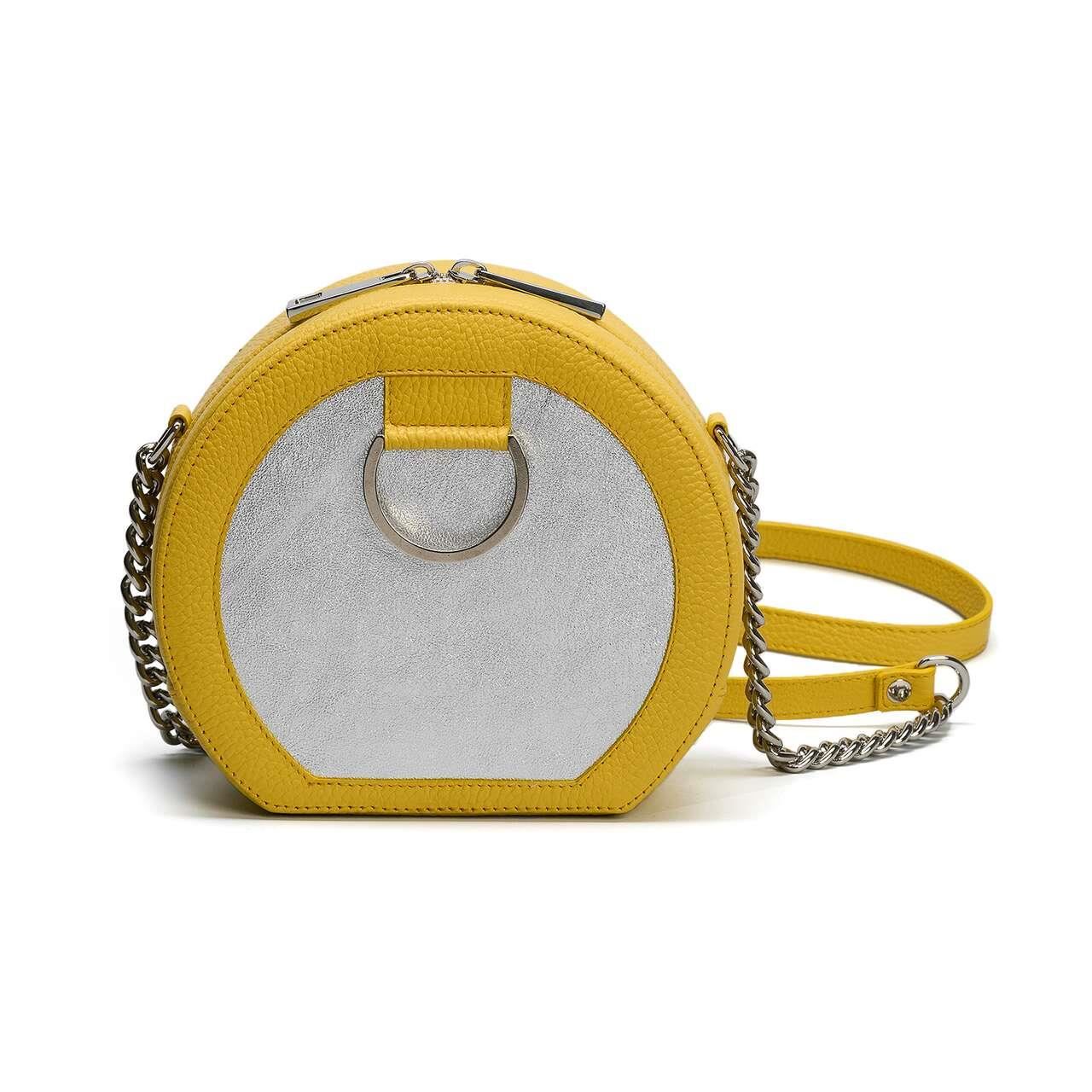 Con un diseño moderno y forma semicircular, el bolso está pensado tanto para outfits de oficina (junto con el Sobre DOT) como para outfits casual chic. - Material exterior: piel natural con textura granulada combinada con piel de becerro fina; - Dimensiones del producto: 19 cm de diámetro, 12 cm de base y 8 cm de profundidad - Bolso bandolera o bandolera con asa de cadena metálica y protección de piel para el hombro (111cm) - Cierre con cremallera metálica - Interior: un bolsillo - Detalles: con accesorios de metal plateado - Hecho a mano en Rumania