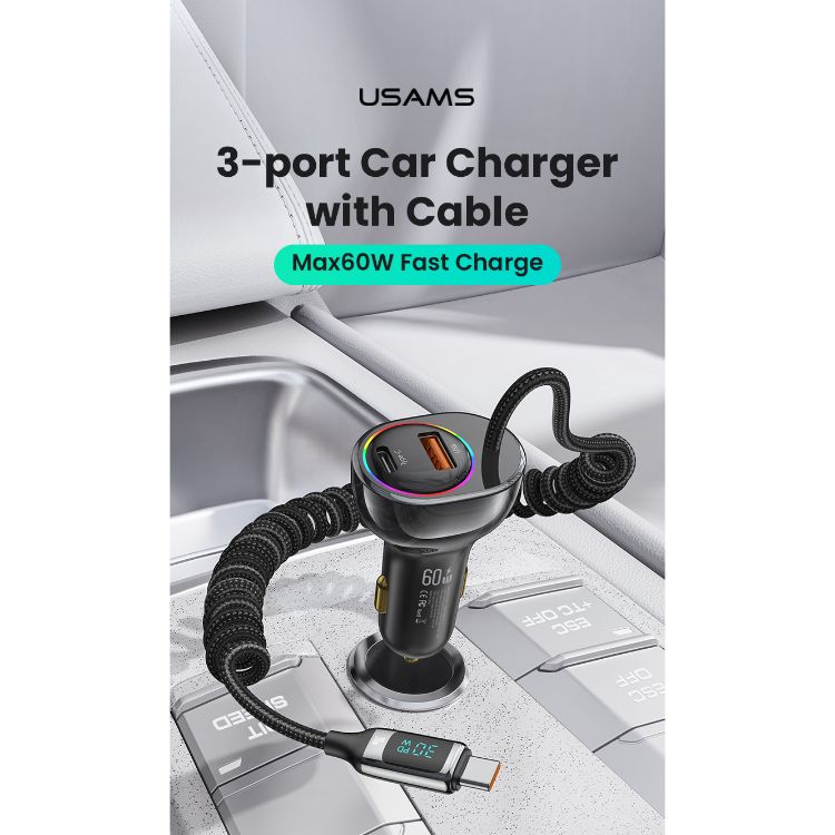 Usams Car Charger Dual USB port and Type-C, Fast Charge Digital Display, PD, 60W, with Type-C cable, Black